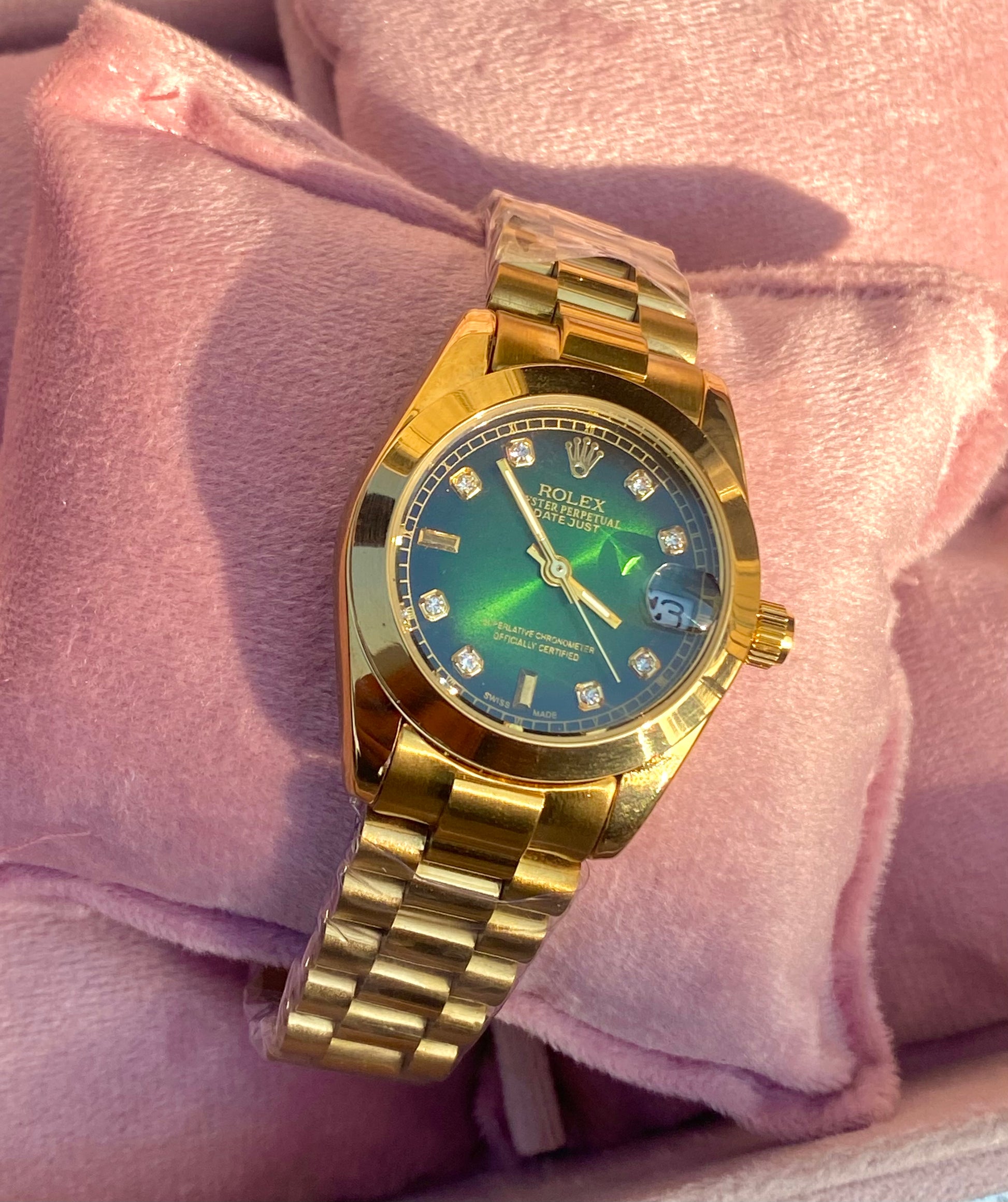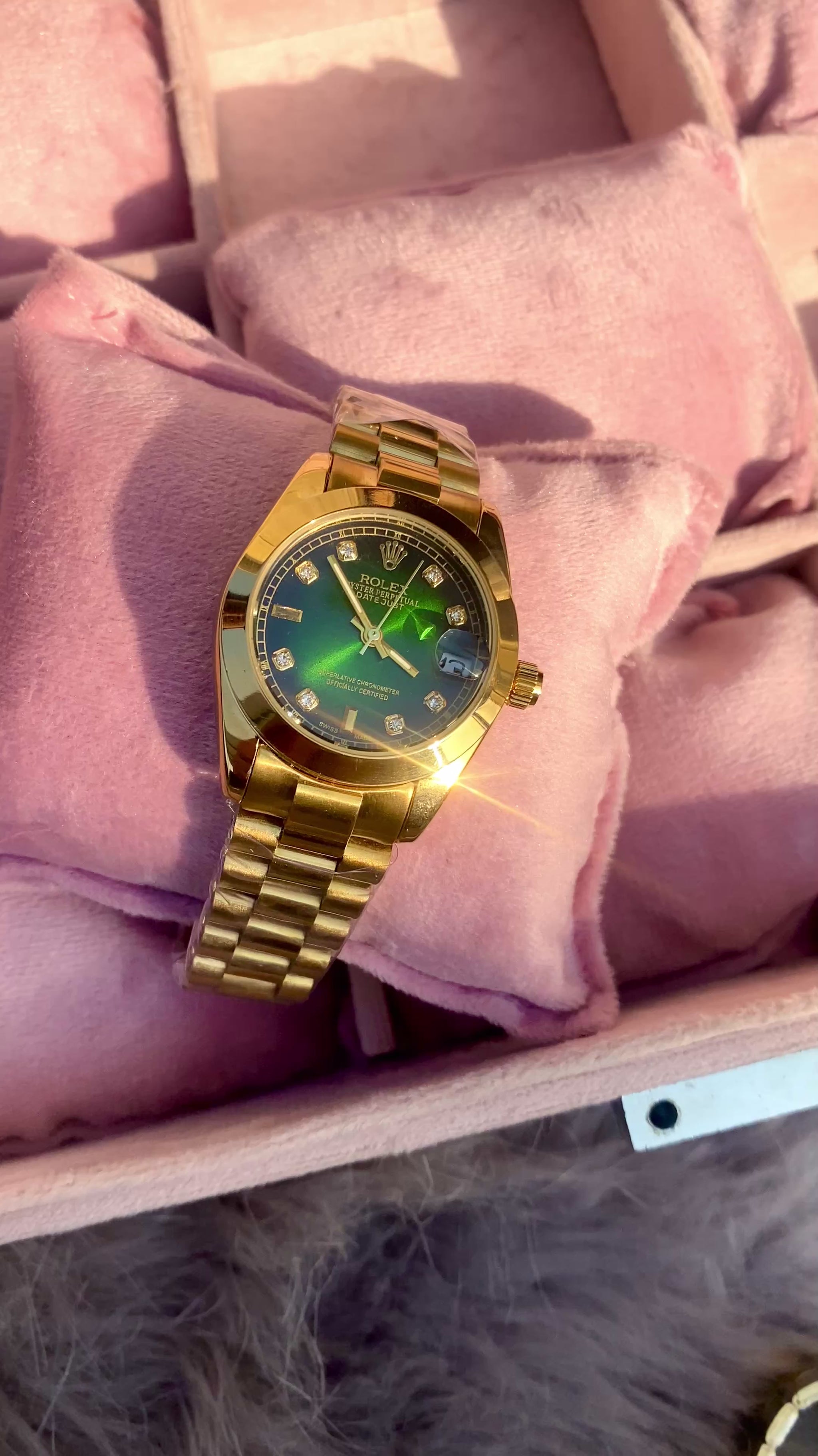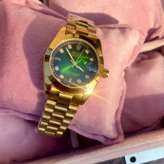 This elegant emerald dial watch features stunning stone stud detailing. With its classic design and sparkling accents, it's the perfect accessory for any formal occasion. The emerald dial adds a touch of sophistication, while the studded stones provide a touch of glamour. Elevate your style with this luxurious timepiece.