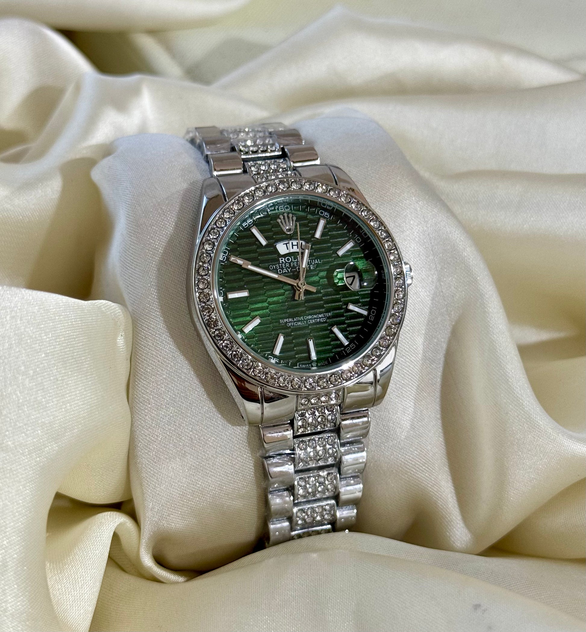 Exclusive emerald Dial and silver crystal studded Chain Classic Watch